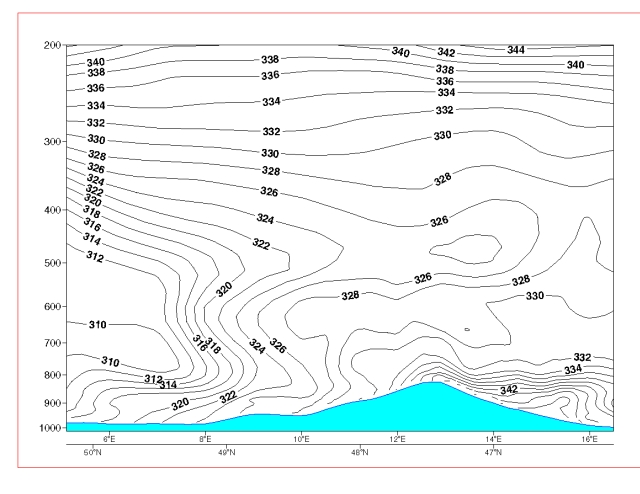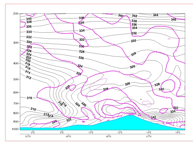 The isentropes show a configuration typical for a system with a pronounced thickness ridge in front of the cold front. The coldfront part in the isentropes shows two phenomena: