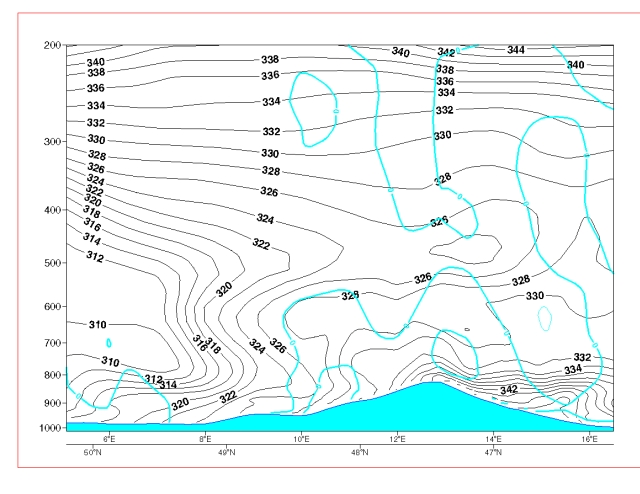 The field of convergence and divergence show a double structure. The cold front part is accompanied by a (backward inclined) zone of convergence. But there is also a second pronounced maximum of convergence found in the lower layers ahead of the front. This corresponds with the pronounced positive temperature advection and the unstable stratification of the equivalent potential temperature.
