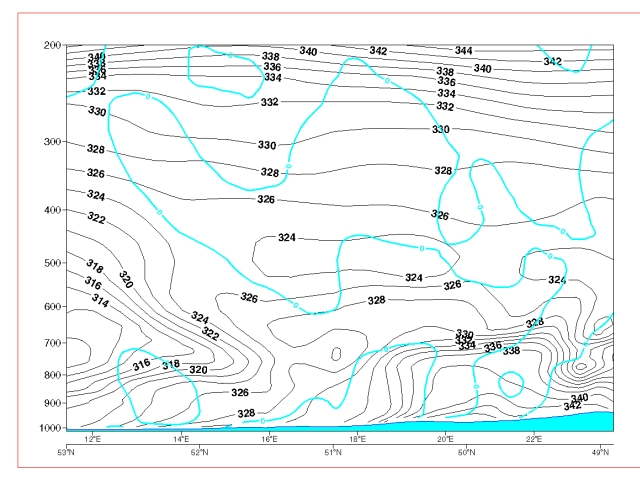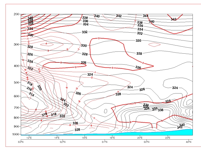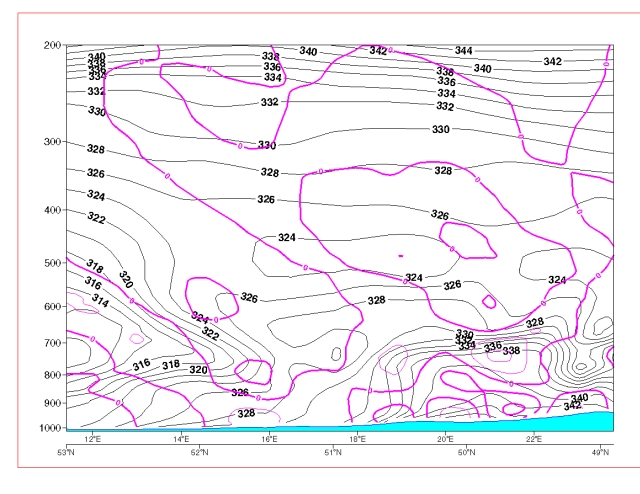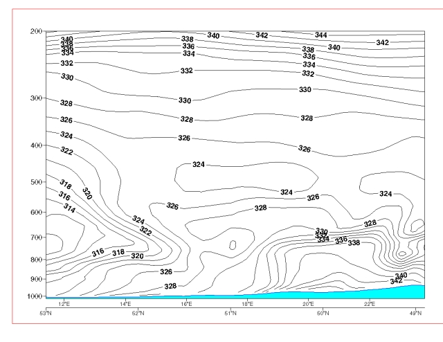 To the west the cold frontal character with foreward aligned isentropes is still well observed. Till 700 hPa the troposphere is clearly governed by an unstable stratification. In the satellite image the prefrontal convergence line is well observed. In this case the isentropes also show an unstable region in the lower troposphere.