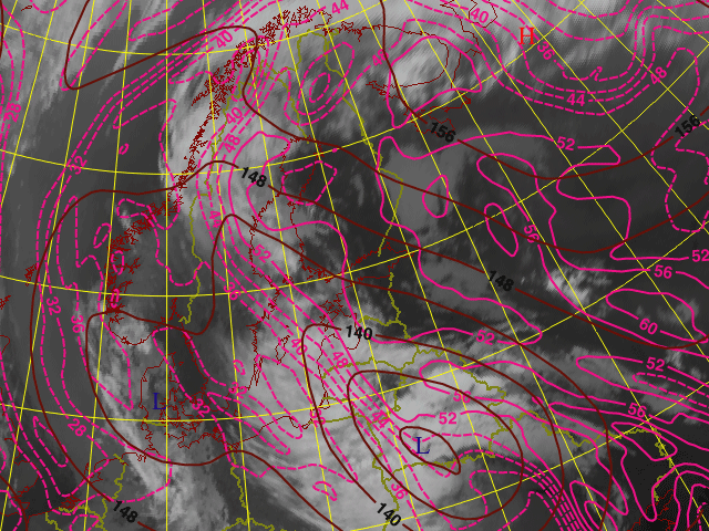 11 Aug 2005/12 UTC - Meteosat 8 IR10.8; Geopotential Height 850 hPa (solid brown), equivalent potential temperature (pink).