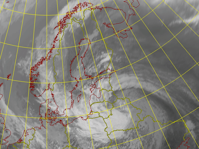 Cold front extends from the Baltic Staes to east and south-east, while warm front cloudiness extends from Lithuania to southern Scandinavia and further to Norway. Occlusion cloudiness spiral is about to develop over Belarussia.