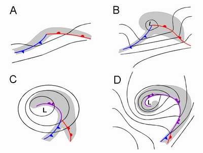 The well known Polar-front theory was described by the Bergen school early 20th century. The theory explains the formation, development and life cyles of cyclones. In short several stages of cyclone development can seperately be identified.