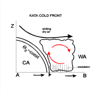 According to classical ideas, cold fronts typically are divided into two main sub-types: Ana and Kata type cold fronts. Real examples of Cold Fronts do not always show these model characteristics, but nevertheless the main characteristics can briefly be summarised as follows: