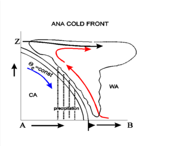 According to classical ideas cold air moves rapidly against warm air, thereby creating convergence at the surface line between the two airmasses. This convergence forces the warm, moist air to ascend on the frontal surface. The cloud band develops, inclined rearward from the surface cold front. Consequently, in this case the main zone of cloudiness and precipitation appear behind the surface front. the surface front passage may be accompanied by intensive line of convection due to the forced ascent, but at the rear of the surface front the precipiation is more stratiform type. This is called an Ana cold front.