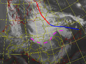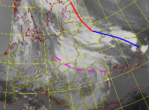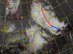 | 08 August 2005/00 UTC. Meteosat 8 IR10.8 image with upper troughs and fronts shown (dashed magenta: upper level trough; solid red: warm front; solid blue: cold front). | 08 August 2005/06 UTC. Meteosat 8 IR10.8 image with upper troughs and fronts shown (dashed magenta: upper level trough; solid red: warm front; solid blue: cold front). |