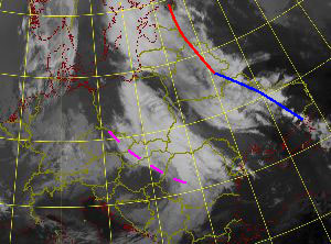 | 08 August 2005/12 UTC. Meteosat 8 IR10.8 image with upper troughs and fronts shown (dashed magenta: upper level trough; solid red: warm front; solid blue: cold front). | 08 August 2005/18 UTC. Meteosat 8 IR10.8 image with upper troughs and fronts shown (dashed magenta: upper level trough; solid red: warm front; solid blue: cold front). |