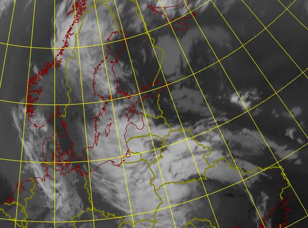 The cloud features show the fronts associated with the low pressure. As the wave occludes, a well-defined spiral occlusion cloud band is formed over the Baltic States. The low pressure matures during during 10-11 August, bringing continuous rain and showers in the Baltic States and Finland.