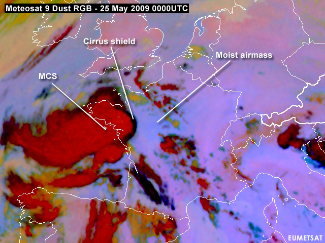 Figure 2.1: Meteosat 9 Dust RGB of 25 May 2009 0000UTC showing the moist airmass over central France in a bluish tone. A positive brightness temperature difference between the channels IR12.0 and IR10.8 used in this RGB indicates high relative humidity. The cirrus shield part of the anvil shows up black in the picture.