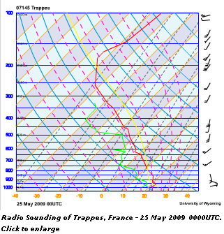 Steep lapse rates, generated by an elevated mixed layer and a moist boundary layer below, were responsible for extreme amounts of convective available potential energy (CAPE) over Western Europe. Additionally, moderate to high amounts of wind shear were in place, emphasising the possibilities for a convective event with large hail (given the high CAPE) and a serious threat of wind gusts (see Fig 2.3).