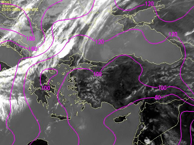 Two synoptic systems are dominant over south-eastern Europe - a high pressure system over Croatia, Hungary and further to the west and the low pressure system over south-eastern Turkey and Syria. Frontal cloudiness coincides with the strongest gradient in the isohypses, and the big convective cell is found at the leading edge of an upper level trough.