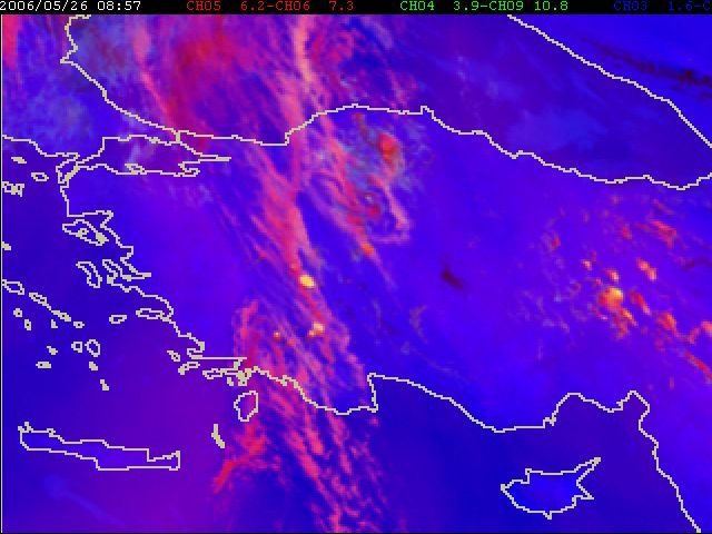 The frontal cloudiness over western Turkey consist mainly of ice particles, both large and small, and yellow spots embedded are signs of frontal convection. Some yellow spots can be recognized far ahead of the front, over the eastern part of Turkey. This is a sign of daytime convection, induced by the orography, common during summer months, and also convection caused by an upper level low.