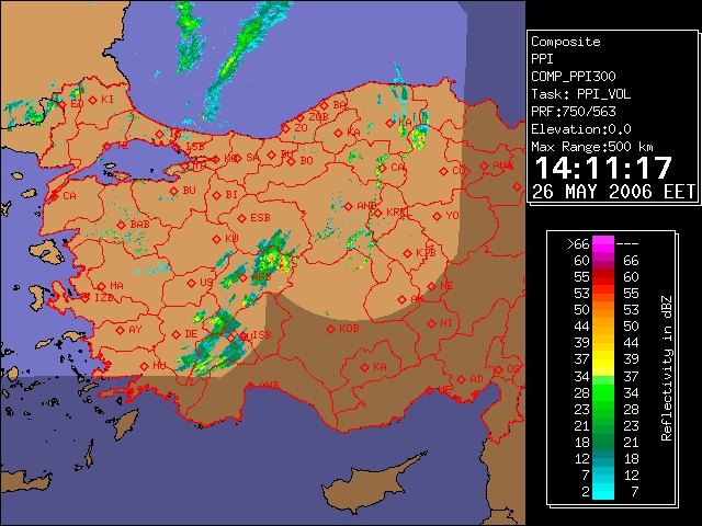 The big part of central Turkey is covered by a large MCSs. The radar shows high reflectivity, especially at the leading