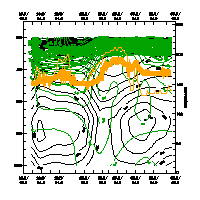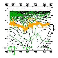 The vertical cross section reveals for both cases very unstable frontal surfaces which are steeply downward inclined and show bulges in the lowest layers. There are differences between the two case studies but generally spoken one can say that the frontal surfaces show maxima of convergence with upward motion on top, cyclonic vorticity behind and PVA in top of the cloud bands. Both case studies show a low tropopause immediately south of the wave bulge but while for the first case (wave A) PV = 1 unit does not protrude further down, is such a process clearly seen in the second wave with PV = 1 values reaching in form of a tongue to 500 hPa. Such situation is well known from cases of rapid cyclogenesis and is typical for the mutual enhancement of cyclogensis from above and from below.
