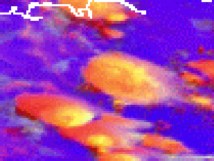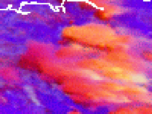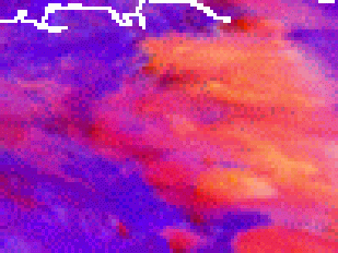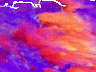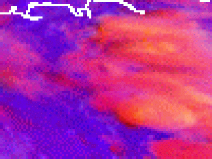With this RGB it is possible to perform more detailed diganostics. An important information in addition to the colour are the areas' shape and its position in relation to the airmass distribution. A convective cell with high potential for intensification exhibits a rounded shape. If the position of the yellow spot is at the "warm edge" of a cell we have to expect a higher probability for cell intensification.
