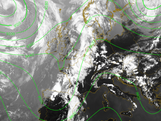 The geopotential height in 300 hPa reveals a well-pronounced upper air trough over western Europe. A ridge is situated over Germany. This region was influenced by potentially unstable subtropical air. Due to upward motion in the forefield of a trough convection was initiated.