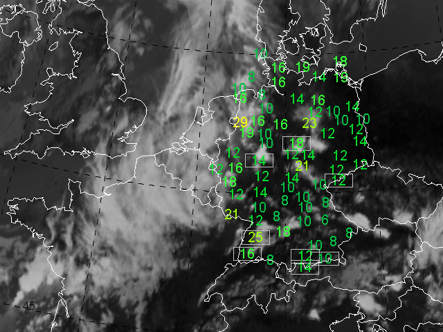 Gusts during the last hour (knots) are given in this chapter. Only stations in Germany are shown. We would expect measurements of high speed because uprooted trees and damaged houses were reported in the media. The image shows only weak gusts. Only over northwestern Germany and the Harz (not shown here) gusts of 29 and 33 knots (Beaufort 7) were measured, respectively.