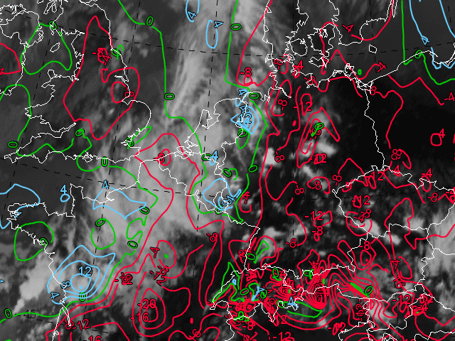 The pressure tendencies' measurements refer to the last 3 hours and are displayed in units hPa/10. From 9 UTC till 12 UTC negative pressure tendencies (red) are found over most parts of Germany, typically in the forefield of a convergence line. West of this convergence we find rising surface pressure (blue, a so-called meso high). This 'dipole structure' is a hint for the onset or an intensifying direct thermal circulation, which leads rather often to a squall line (see surface analysis 12 UTC).