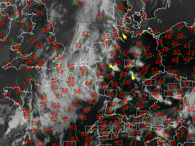 The wind barbs indicate zones where convection has to be expected or started already. Some convergence zones which can be identified by the data are marked by the arrows.