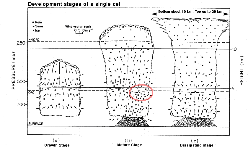 The starting rainfall in the mature stage causes a "downdraft" of cold air by mechanical entrainment (see fig. b), marked region, cell moves from right to left). This cooled air is produced by melting iced and evaporating liquided precipitation elements. A temperature contrast between downdraft and updraft develops. At this stage the updraft is two times higher than the downdraft. However, the downdraft transports cold air to the surface layer, where a local "gustfront" develops at the transition zone to the warm air. In the further development the cold air at the surface layer disrupts the warm air updraft from the ground and the thunderstorm cell breaks down. The dissipating stage (see fig c) begins where rain falls out and the cloud begins to dissolve.