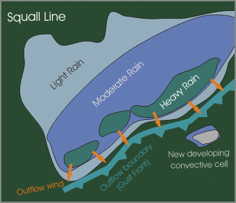 linear convergence structures. The thunderstorms first develop where the best combination of moisture, instability and lifting is to be found. The storm continues to evolve and new cells develop (commonly east and southwards). The squall line sustains itself by producing immanent vertical circulation processes due to outflow boundaries at the leading edge. At the rear, a large pool of cold air with continuous rain develops and causes a strong temperature gradient. Lifted by cold outflowing air, new convective cells can develop in front of the squall line. By merging with these cells the movement of the squall line can be accelerated and can differ from the main streaming direction. The squall line continues to propagate as long as instability and moisture remain present out ahead of the squall line. The lifespan of a squall line might be more than 12 hours in extreme cases. |