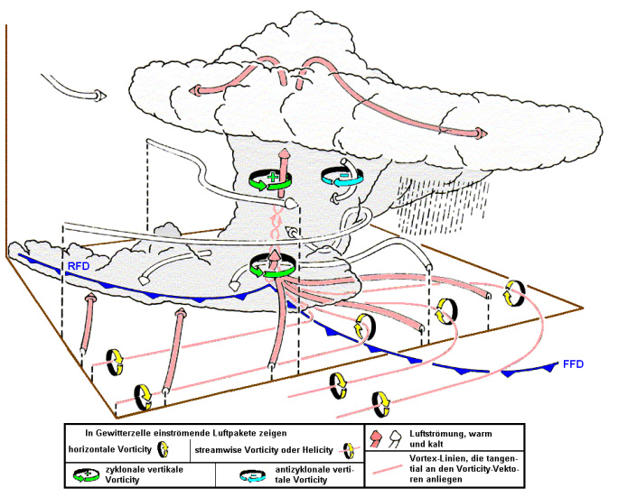 The diagram above shows the relative streaming within a super cell (RFD: Rear flank downdraft / FFD: Forward flank downdraft). If the lifetime of super cell is long enough we observe a positive feedback between the production of positive vorticity and horizontal convergence (Divergence term) because the upward streaming air packages are stretched. The cold air comming from the super cell (FFD) spread itself horizontally under the warm air streaming to the frontal sited of the super cell. At the boundary of warm and cold air a direct thermal circulation starts equivalent to the production of horizontal vortcity (diagram: „streamwise vorticity"). In the updraft of the super cell the horizontal vorticity is changed to positive vertical vorticity (twisting term). Additionaly, we observe an extreme accelaration and an stretching. The divergence term of the vorticity equation leads to a cyclonic circulation. Now, the positive feed back between convergence and the development of positive vertical vorticity starts yielding finaly an increase of circulation within the lower parts of the atmosphere. Sometimes a tornado develops.