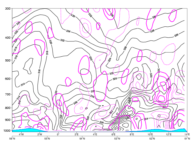 This cross section shows clearly high potential instability over Germany (between 6° and 12°E). The vertical orientation of the maximum values of the equivalent potential temperature shows the position of the convergence near the surface and a divergence in middle altitudes (8 to 10°E). The satellite image shows here frontal cloud bands. From 11° to 12°E we see a divergence near the surface and a convergence in higher levels equivalent to a stabilisation tendency at this time and in this region. East of 12°E the image reveals near the surface convergence and divergence in upper levels. The convergence between 10 and 12°E corresponds well with surface measurements.