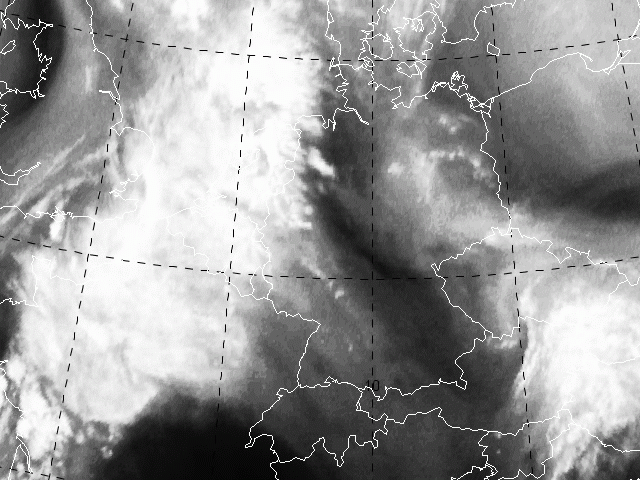 During morning hours a band of high humidity extends from Western France over the Low Countries up to the North Sea. Above eastern Austria and the Czech Republic another region of high water vapour contents can be observed. The grey and dark regions contain less water vapour.