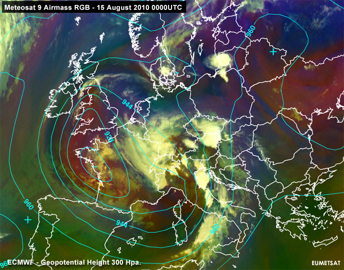 Figure 2.1: Meteosat 9 Airmass RGB with ECMWF Geopotential Height 300 hPa. - 15 August 2010 0000UTC