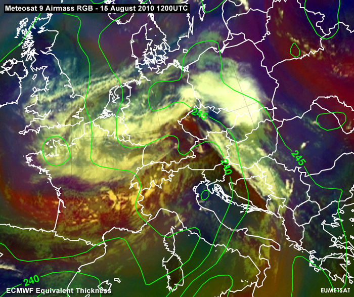 Figure 2.2: Meteosat 9 Airmass RGB with ECMWF Equivalent Thickness. - 15 August 2010 1200UTC