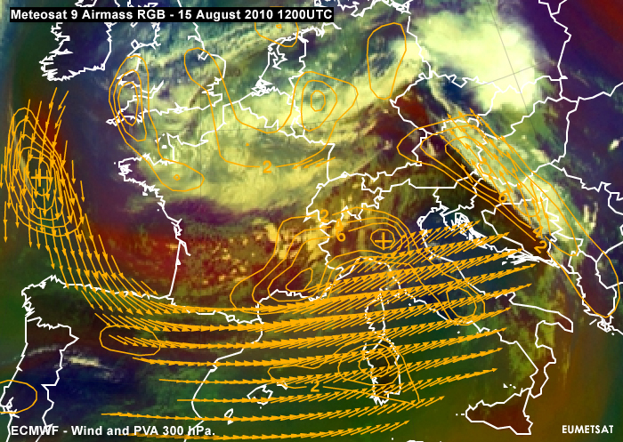 Figure 2.3: Meteosat 9 Airmass RGB with ECMWF Wind and PVA at 300 hPa. - 15 August 2010 1200UTC