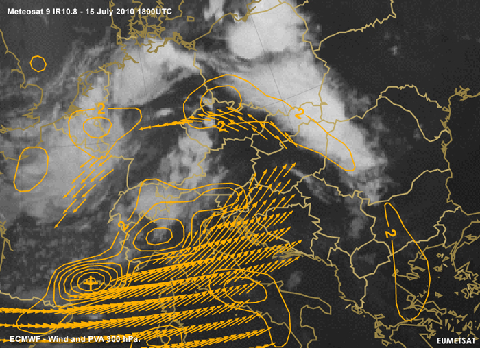 Figure 2.6: Meteosat 9 IR10.8 with ECMWF Wind and PVA at 300 hPa. - 15 August 2010 1800UTC