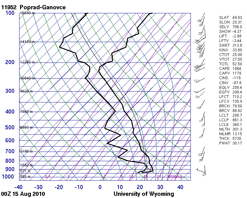 Figure 2.4: Radio Sounding Poprad-Ganovce - 15 August 2010 0000UTC (source: the University of Wyoming)