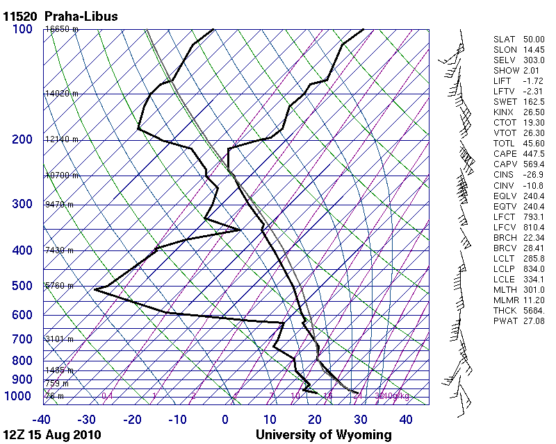 Figure 2.4: Radio Sounding Prague - 15 August 2010 1200UTC (source: University of Wyoming)