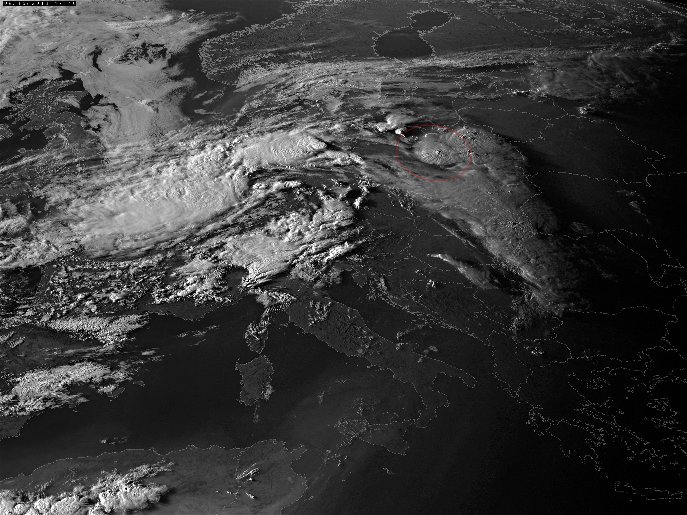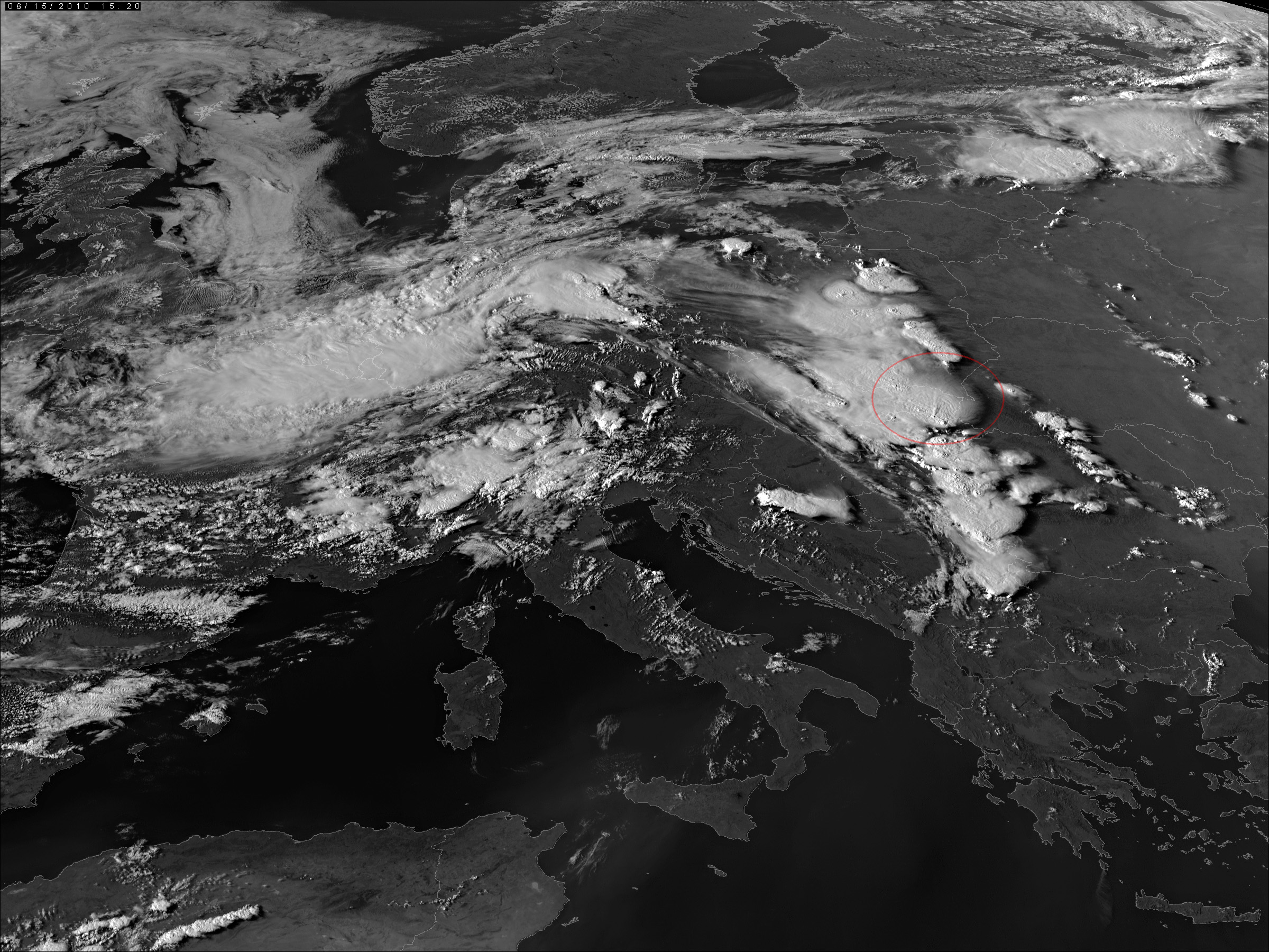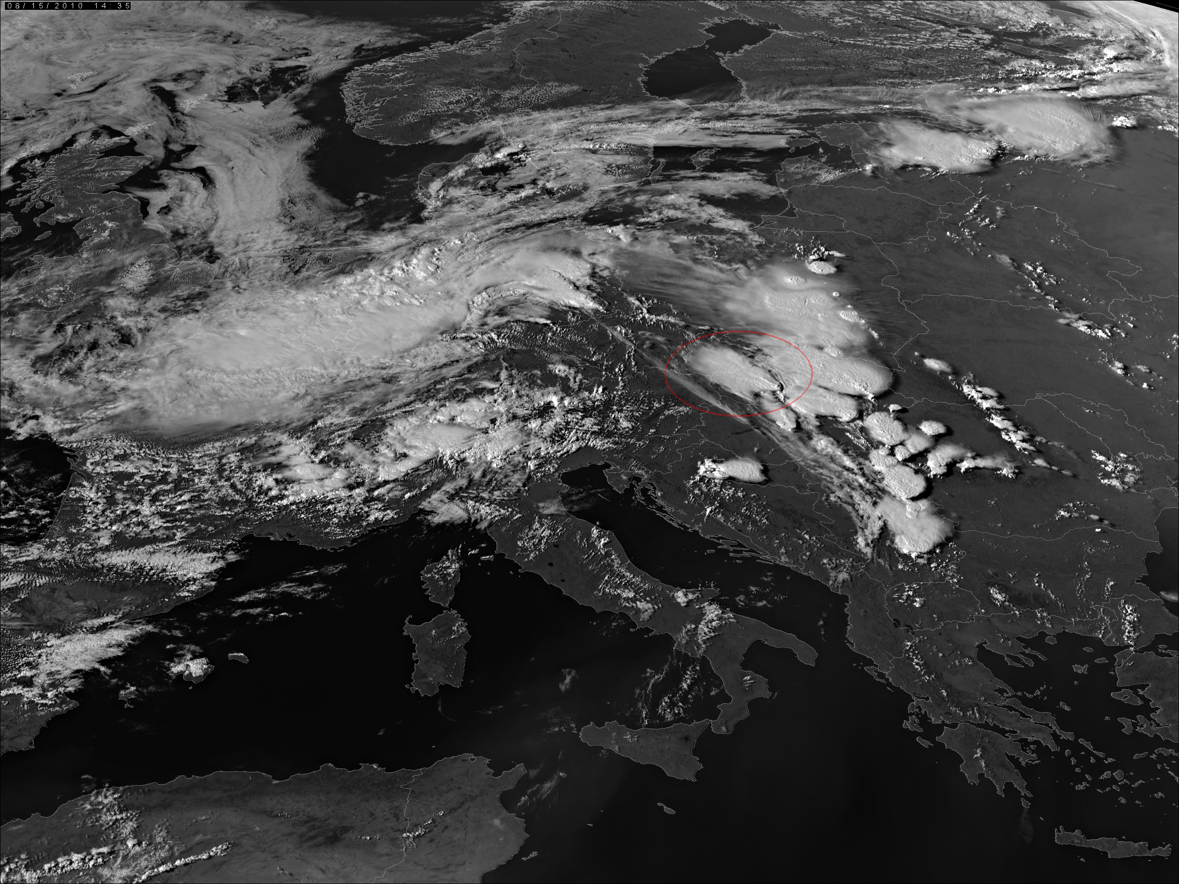 Finally, there are about 15 passes of these storms by polar orbiters - NOAA and MetOp with AVHRR instrument, and Terra and Aqua with MODIS instrument. In the 01:15 UTC overpass Aqua/MODIS captures already weakening storms above eastern Austria and the Czech Republic, while CloudSat provides a vertical profile of these. This allows the validation of the satellite-derived cloud-top products (namely CTH) using the CloudSat observations, and its favorable location allows it to compare the CloudSat profile with those derived from the operational weather radars within the area.