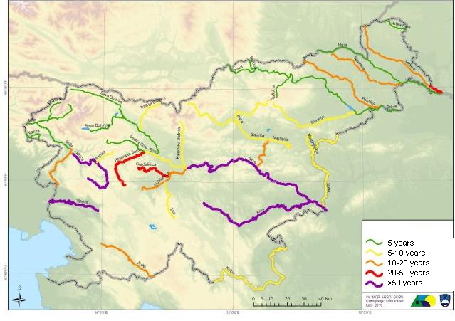 Figure 1.4: Return periods for strenght of floods for some rivers in Slovenia. Source ARSO.