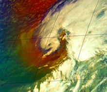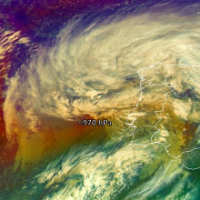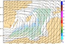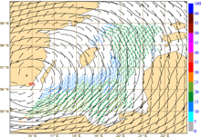 Around 22 UTC on the 26th, ASCAT passed once more over Xynthia, while pressure in the centre was dropping intensively. With a pressure decrease in the last 24 hours of 14 hPa at 18:00 UTC on the 26th and 18 hPa at 00:00 UTC on the 27th (ECMWF analysis), Xynthia could, at this stage, be classified as an explosive cyclogenesis, or bomb (Figure 2.4.1).
