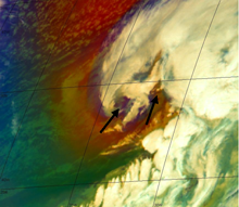- Apart from the main pressure centre already mentioned, a second pressure minimum appears around 41.5°N 11.5°W (also 985 hPa), on the eastern edge of the plotted ASCAT swath. This may indicate either the existence of a secondary low, or simply a wave along the warm front that is carrying an airmass northwards ahead of Xynthia on its northeasterly trajectory.