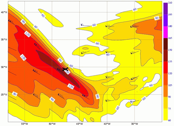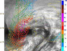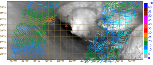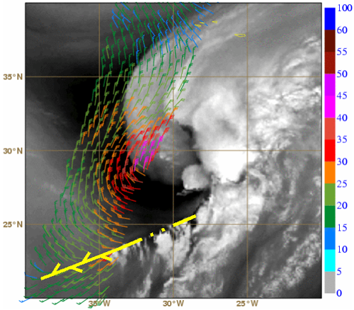 Around noon on the 26th, when passing south of the Azores, the storm was still showing much convective activity, with a prominent cloud head as well as an impressive dry intrusion. Although at this stage ASCAT only observed the western flank of the storm, it measured strong gale winds (Beaufort 9) up to 45 kt and, in a larger area, over 40 kt, thus still inside the reliable range for ASCAT winds (Figure 2.3.1). To the south a clear wind convergence line was found in the ASCAT wind product (depicted in yellow in Figure 2.3.1). It connects with a line of convection in WV6.2 (depicted as an instability line, also in yellow), but unfortunately the ASCAT winds do not reach this area. This line matched the sharp air mass gradient area that existed for the past 24 hours around the Tropic of Cancer (see Figure 2.1.4).