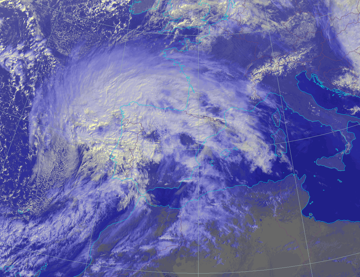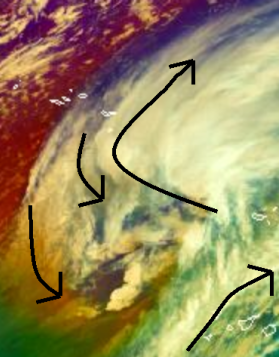 In this period, Airmass RGB images made it possible to distinguish some cold air patches (in darker blue) among clouds and stratospheric air intrusions near the low centre (Figure 2.4.4). Several cloud layers with their corresponding movements are also plotted in Figure 2.4.4, as suggested by the sequence of images between 18:00 and 21:00 UTC (Figure 2.4.5).