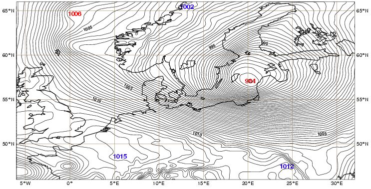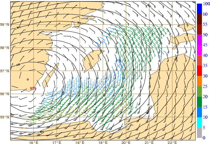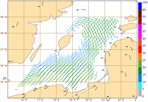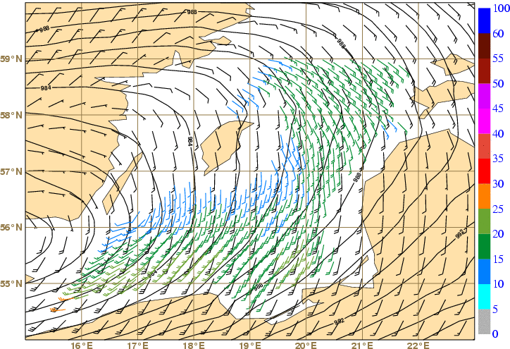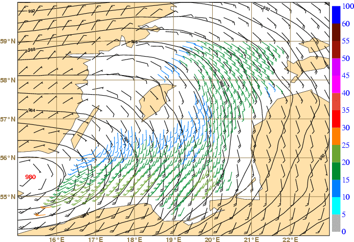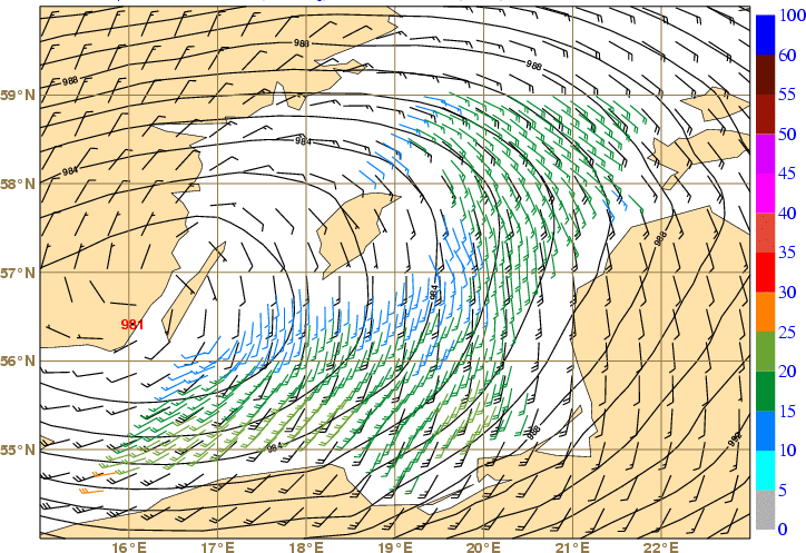 At 12:00 UTC on 1st March, Xynthia was still near the Swedish islands of Öland and Gotland also with 982 hPa in its centre (ECMWF analysis). During this day Xynthia slowed down, with an easterly displacement of 15-20 kt, which was clearly below the speed it had attained before. Despite its occlusion stage, there was still a warm sector, bringing milder air to these regions ahead of the storm. At 18:00 UTC Xynthia was located between Gotland Island and Estonia (Figure 2.8.4) and it continued its path towards the Gulf of Riga, making its last landfall late that day. Thereafter, Xynthia weakened in the northwestern part of Russia and, according to the University of Berlin (which named the storm in the first place!), made its last appearance on the weather charts on 5th March 2010.