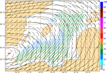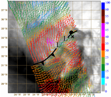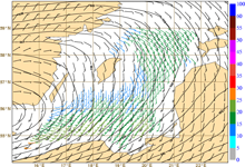 The superposition of ASCAT winds with forecasts at 09:00 UTC from the last four 00:00 UTC runs is shown in Figure 2.8.3 and depicts how the ECMWF model tuned Xynthia's centre location on consecutive runs, with slight eastward or northeastward shifts every day.