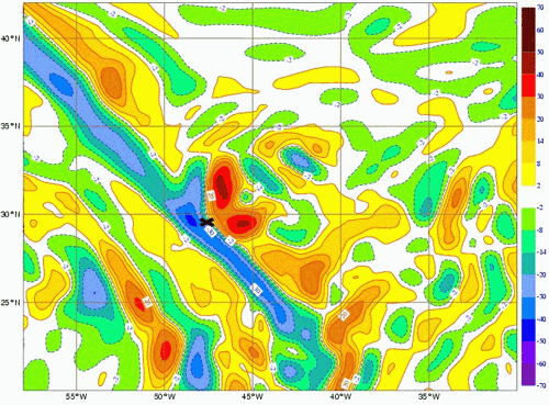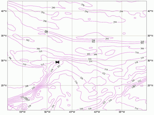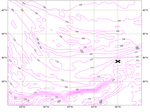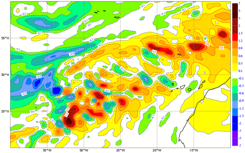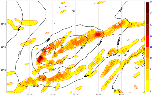 Regarding the pressure field, the ECMWF MSLP analysis field on 26/02/2010 at 12:00 UTC showed a large low-pressure system, with two sub-lows but with the absolute minimum value (997 hPa) in the northeastern sub-low, around 29.5°N 30°W (Figure 2.3.2). This pattern was also suggested by the 24 hour forecast, but not by the 12 and 36 hours forecasts, which identified a main low-pressure system on the west side. At 12:00 UTC a drift buoy located close to the southwestern sub-low, at 28.5°N 32.5°W, reported 994.4 hPa, around 5 hPa deeper than ECMWF analysis for that location.