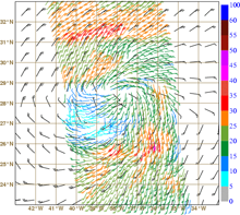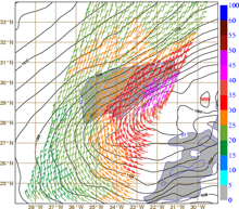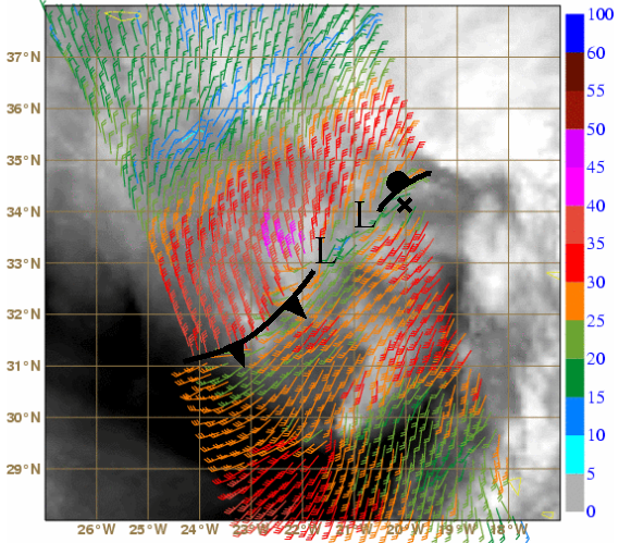 i) ASCAT clearly showed a well defined boundary between southwesterly and northwesterly winds, in the leftmost part of the swath, suggesting a cold front wind pattern at the surface (as plotted in Figure 2.4.2, left). Nearer to the centre of the swath, opposite winds (northeasterly and southwesterly) could be found along an axis from 33°N 22°W to 34.5°N 20°W, suggesting the existence of more than one low. Finally, in the rightmost part of the swath, the wind pattern fit to the existence of a warm front. In general, the north side of the storm presented higher wind speeds (in the range 40-42.5 kt) than the south side where winds did not exceed 35 kt. ASCAT thus suggested that Xynthia was still a complex low at the surface (see two possible lows in Figure 2.4.2, left).
