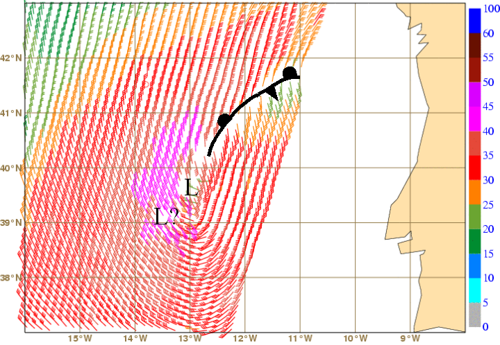 - Around 39°N 13.5°W, opposing winds can be found in a pattern that, again, suggests the existence of a third centre. In this case, the overall northwesterly flow around the opposing winds may support the idea that the ambiguity removal scheme on ASCAT wind processing (see Chapter 1.2 for more details) may have not made the best choice in this case.