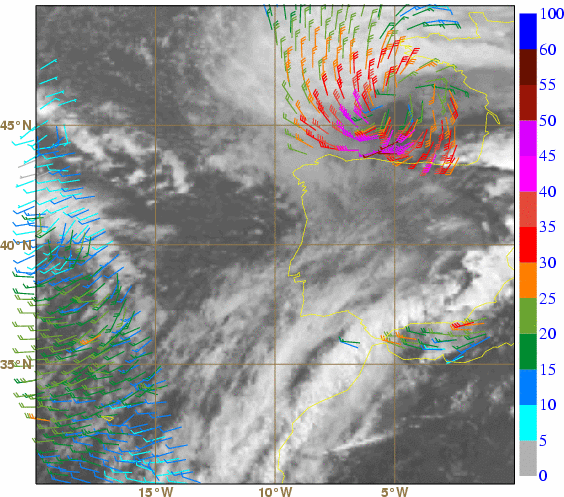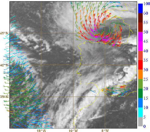 The low-pressure system that later become Xynthia was observed by ASCAT on 25th February 2010 between 12:52 and 12:55 UTC (Figure 2.1.1). The nearest (in time) MSG observation corresponds to the 12:45 UTC image (MSG scan time of this area around 12:55 UTC) and confirms how the two ASCAT swaths surround the most active area, as the dry intrusion and cloudy areas clearly lie between the two swaths. The left swath shows northeast winds ranging between 25 and 30 kt (Beaufort 6 to 7), corresponding to the northwest quadrant of the low. To the east of the most active area, winds in the right swath are in general below 20 kt.
