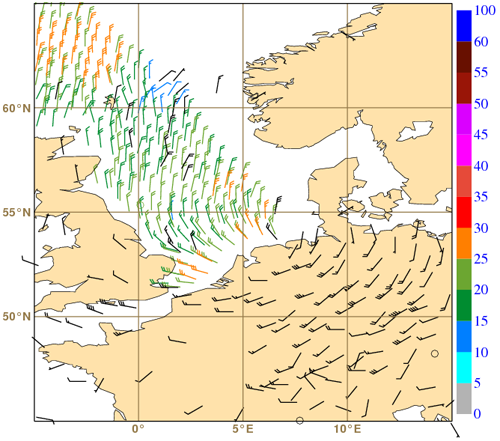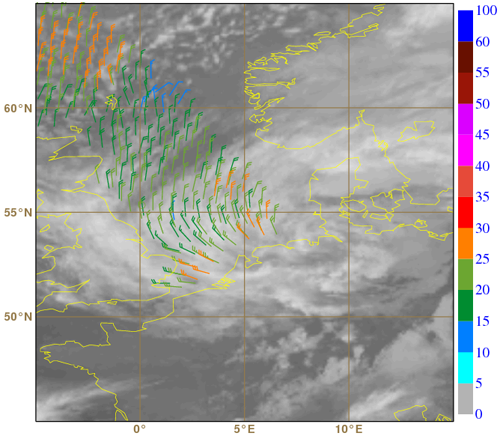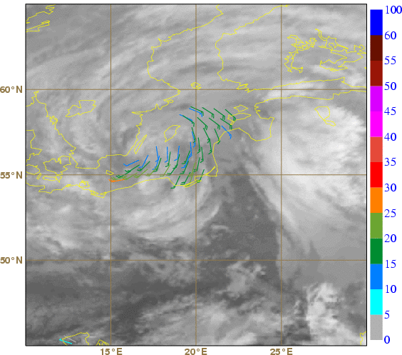 The ASCAT view of Xynthia over the North Sea in the late afternoon on the 28th was basically a glimpse of the northwestern part of the storm (Figure 2.7.3). In fact, the closest MSG IR10.8 image (at 19:45 UTC) and in-situ wind observations (at 20:00 UTC, see Figure 2.7.4) are better tools for identifying the centre location at that time, when it was already close to the German/Danish border.
