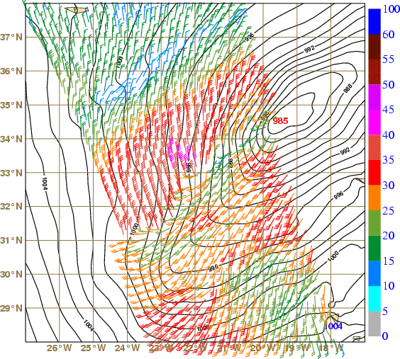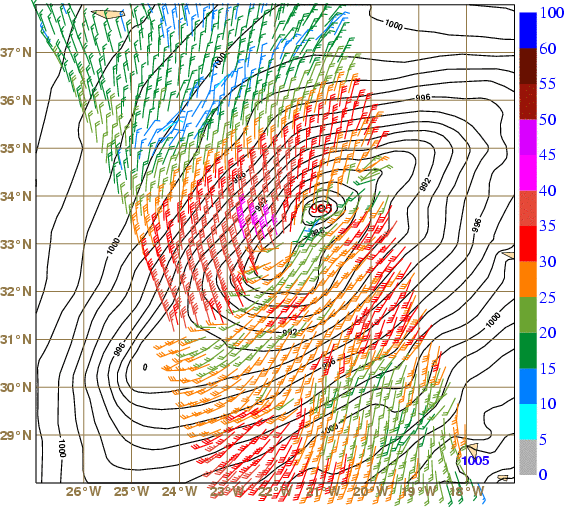 The UWPBL model output (using ASCAT wind as input) clearly depicts the curved isobars on the west side of the storm, most likely the southwestern sub-low (Figure 2.3.3). The minimum sea level pressure along the pass was 995.4 hPa at 28°N 32°W, therefore lying between the "time-corrected" values derived from the ECMWF analysis and buoy observation. Note, however, that neither ASCAT nor buoy caught Xynthia's centre.