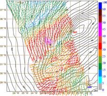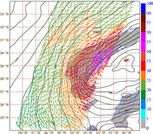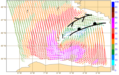 Around 21:50 UTC, the ASCAT wind pattern supported the possibility of a frontal trough, as it was consistent with a warm front located east-northeast of a dominating low around 45.5°N 5.5°W (Figure 2.6.2). ASCAT also clearly showed that there were now stronger wind speeds along Xynthia's southern border, with storm winds of 52.5-55 kt (Beaufort 10) at 44°N 5°W, that is, only 50 km off the Asturian coast (but outside the usually accepted reliable range for ASCAT). The ASCAT wind directions were consistent with BUOY/SHIP observations (in black barbs in Figure 2.6.2, obtained within 10 minutes of the ASCAT pass) but wind speeds were generally 5 kt weaker in ASCAT.
