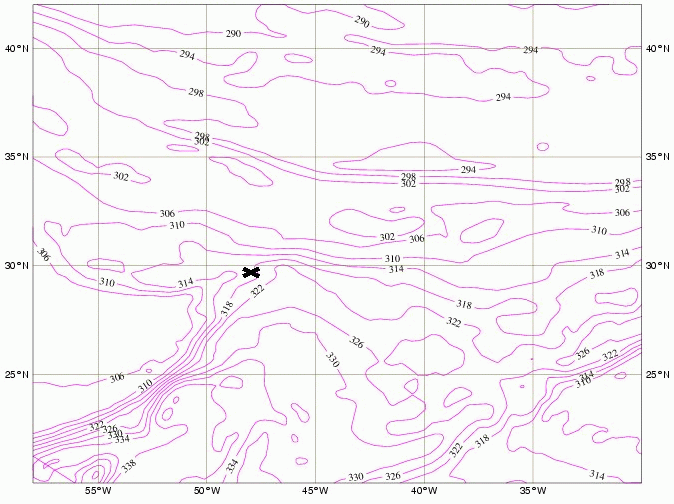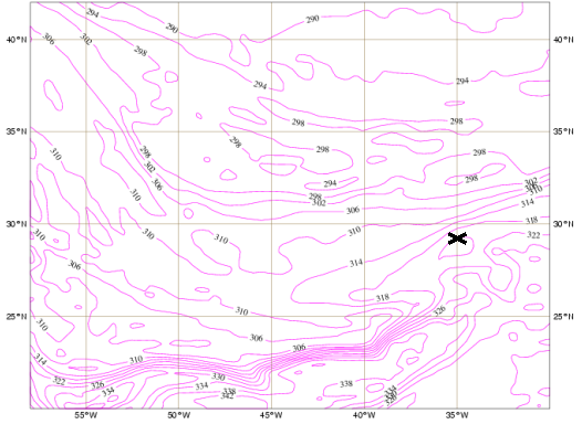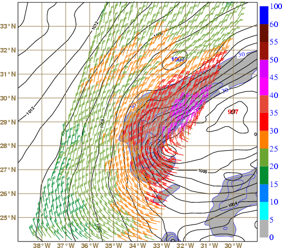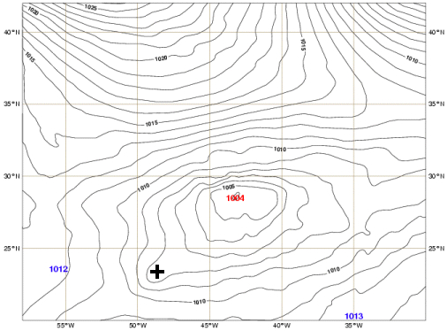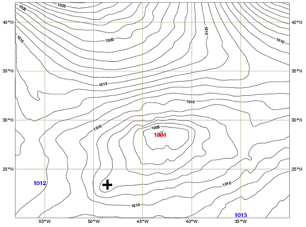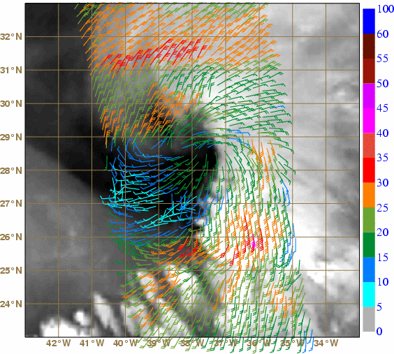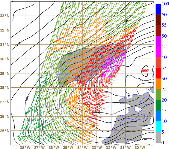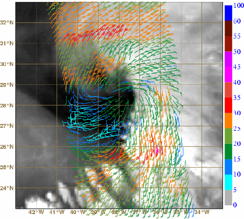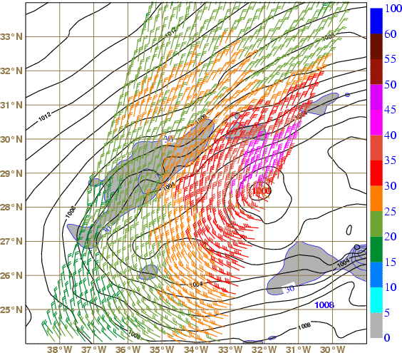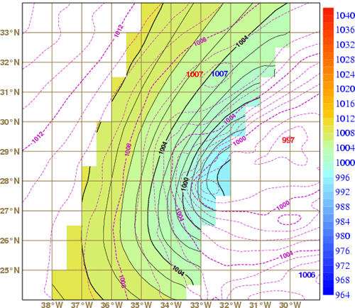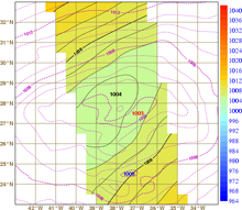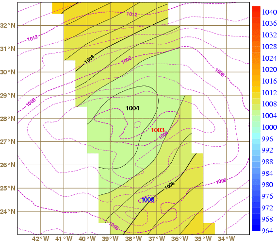 In fact, the minimum pressure centre at the surface was not totally clear in ECMWF's MSLP analysis, although a value of 1003 hPa, approximately at 27.5°N 37°W was proposed (Figure 2.2.3, right). In Figure 2.2.3, the MSLP analysis is overlaid with the surface pressure derived from ASCAT winds, which is obtained with the Planetary Boundary Layer Model from the University of Washington (UWPBL, more details in Patoux et al, 2003). This promising estimate, which is valid both in mid-latitudes and tropics, suggests a minimum of 1004.3 hPa, therefore very close to the ECMWF estimate, but around 150 km to the northwest, at 28.5°N 38°W. These estimates correspond closely with a 00:00 UTC observation of 1003.4 hPa from a drift buoy located around 26°N 38°W, where the ECMWF and UWPBL estimates are around 1005 hPa and 1005.5 hPa, respectively.