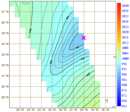 Using only buoy observations in the area, the minimum pressure at 22:00 UTC would be located near 34°N 20°W, on the right edge of the ASCAT swath, with an estimated value of 984 hPa (see black cross in Figure 2.4.2, left).